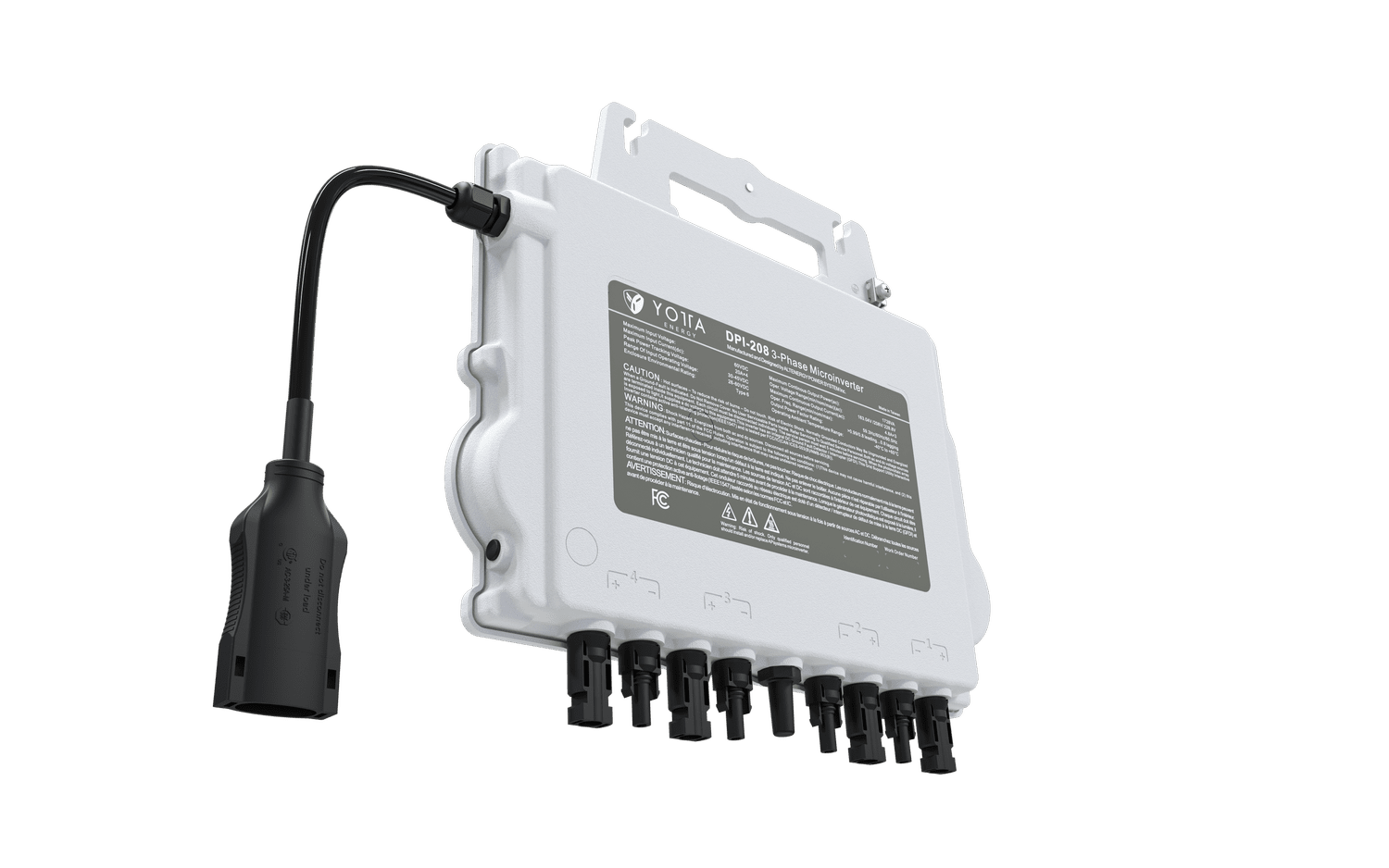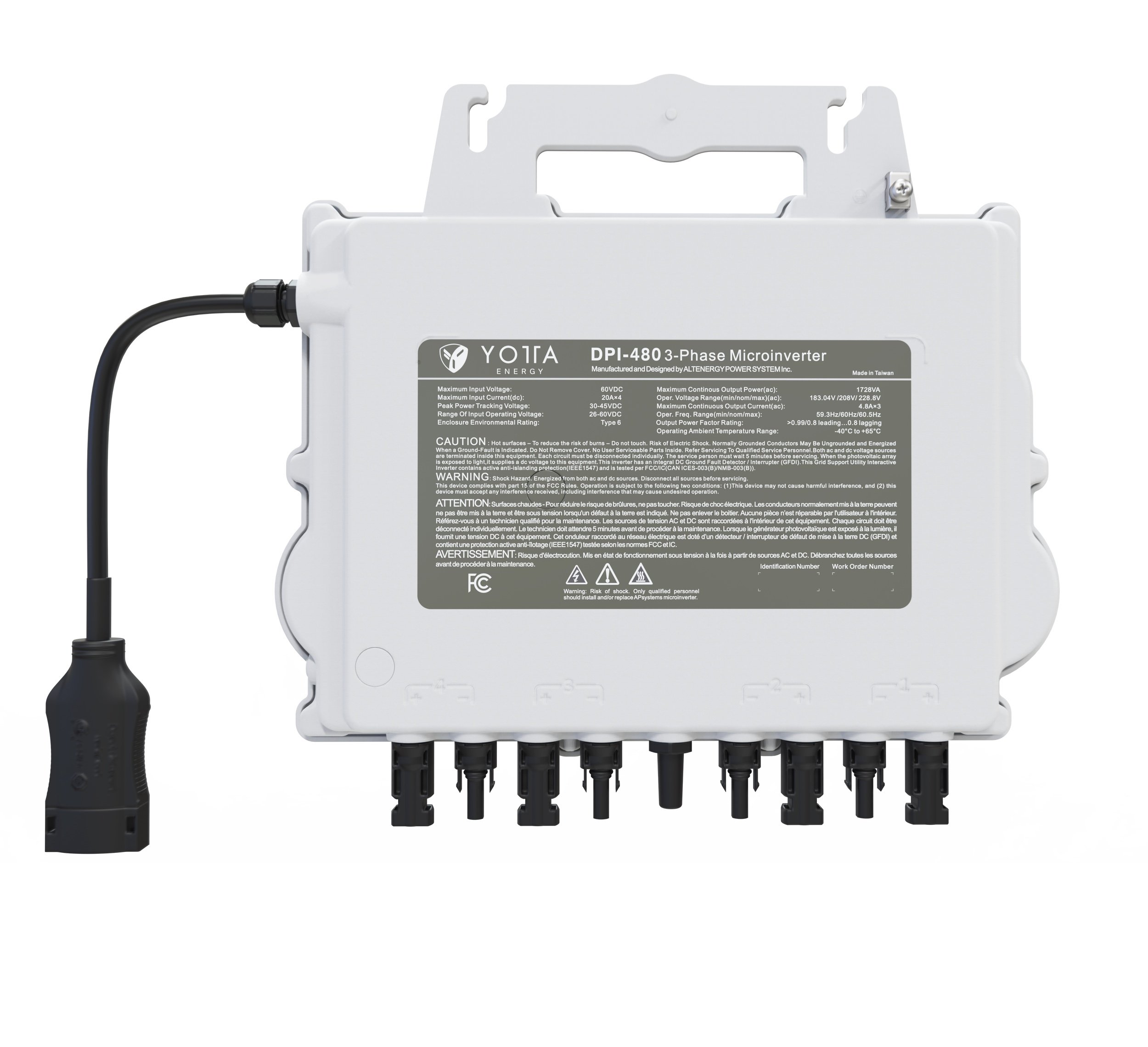 Yotta’s Microinverter (DPI) is designed for three-phase grid connection (208V or 480V) and has dual applications: solar only or solar + energy storage. This unique feature delivers maximum flexibility and brings all the benefits of a microinverter at a price equivalent to string inverters. Rated at 1.8kW @ 480V and 1.728kW @ 208V, this four-port, three-phase microinverter can be used with up to four, high-capacity PV modules and is compatible with the Yotta Block energy storage technology and high-performance bi-facial solar modules. Yotta’s DPI-208 and DPI-480 are powerful plug-and-play MLPE microinverters that install faster than any other solution in the market and comply with rapid shutdown requirements. Their design improves thermal dissipation while maximizing power production.