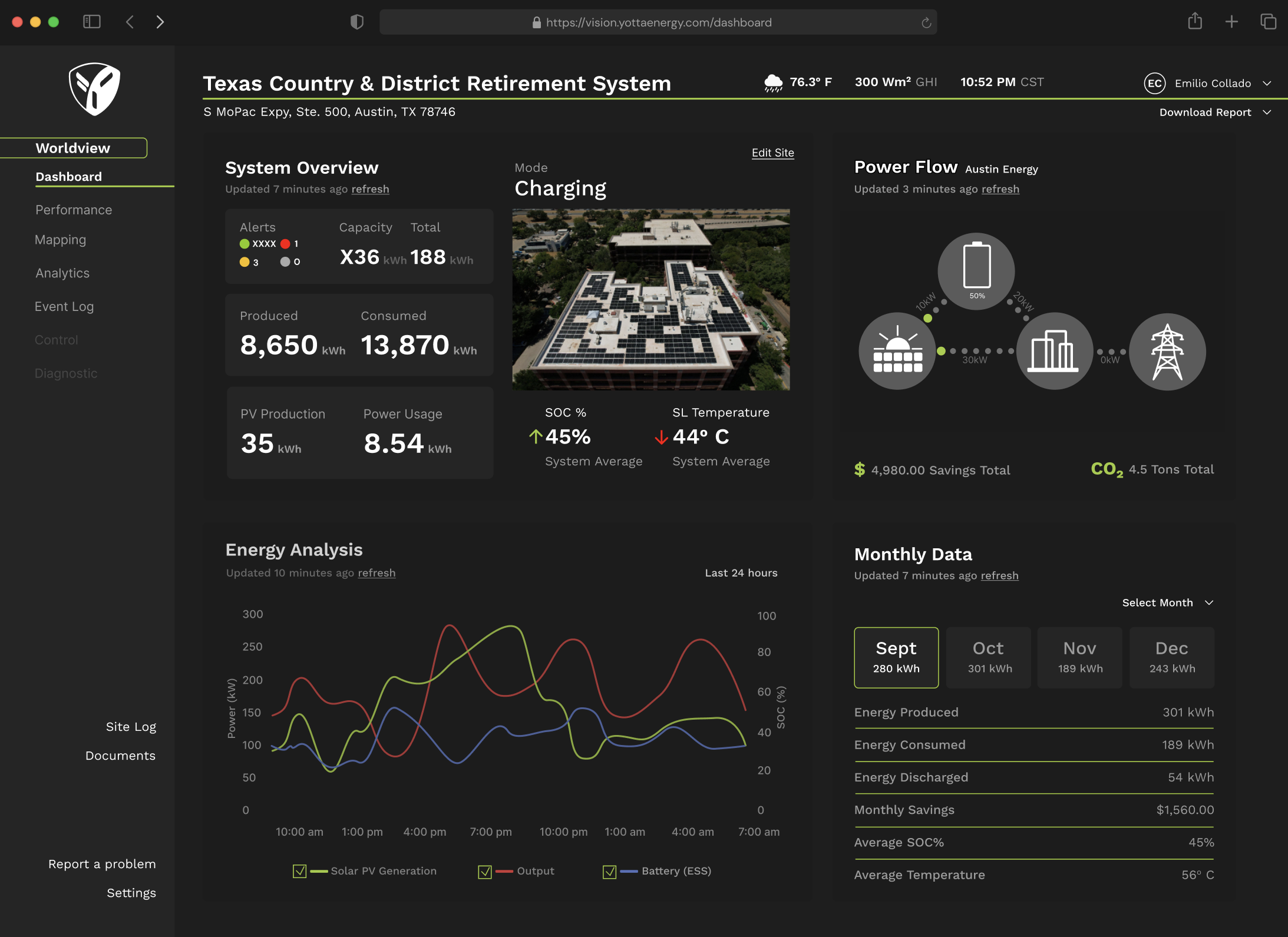 YOTTA VISION 2.0 integrates brand new features. Understand how your system performs at both a system and a module level. Design and edit your site natively through the DXF tool. The new mapping visualizations precisely show when an event occurred. Keep track of temperature, energy consumption, energy captured, output, SOC (%) and store all your commissioningdocumentation in the same place.